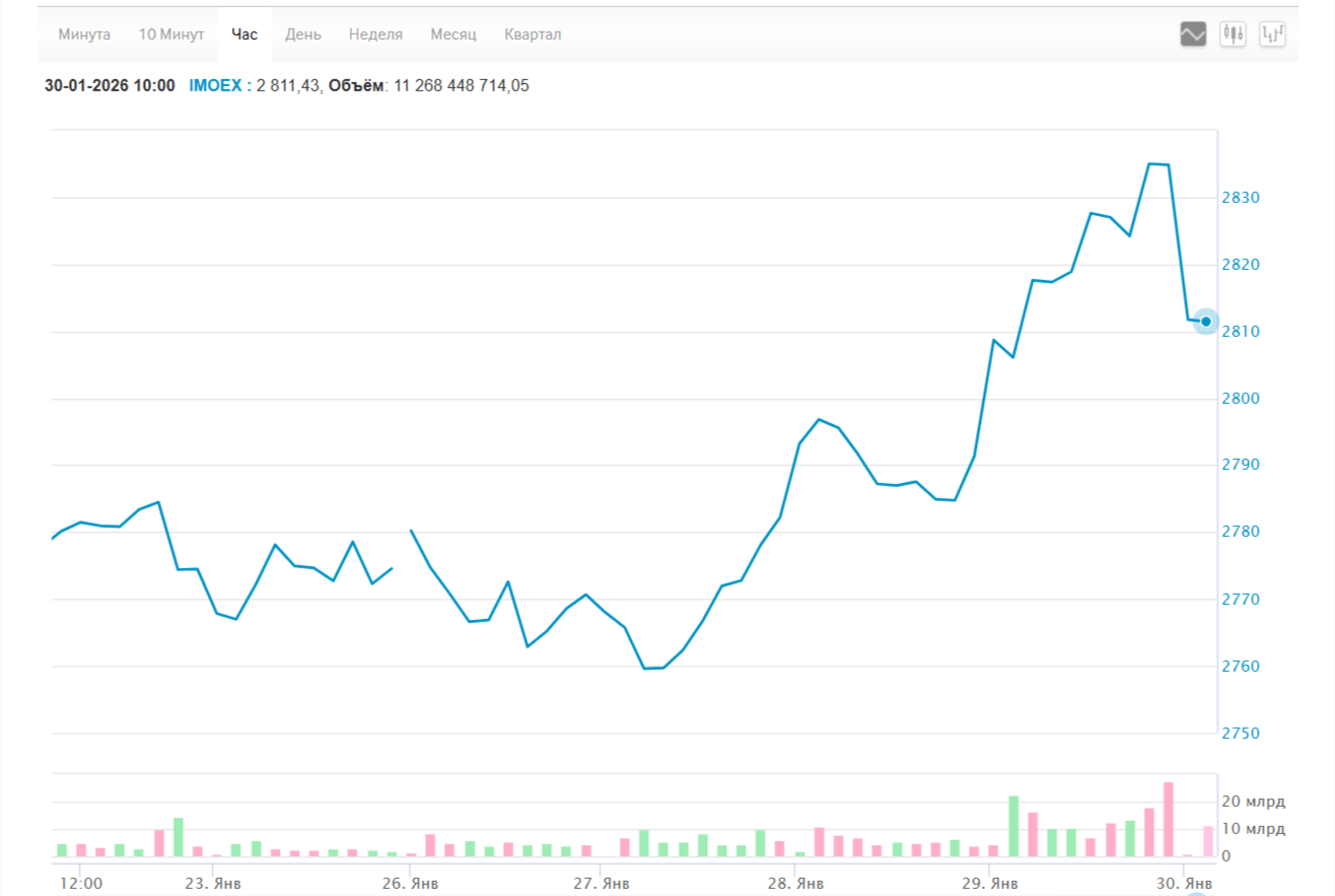 Индекс Московской биржи на основных торгах 29 января 2026 года закрылся на отметке 2 797,76 пункта, что всего на 0,35% выше, чем днём ранее. Но это не значит, что все акции торгуются в пределах индекса.