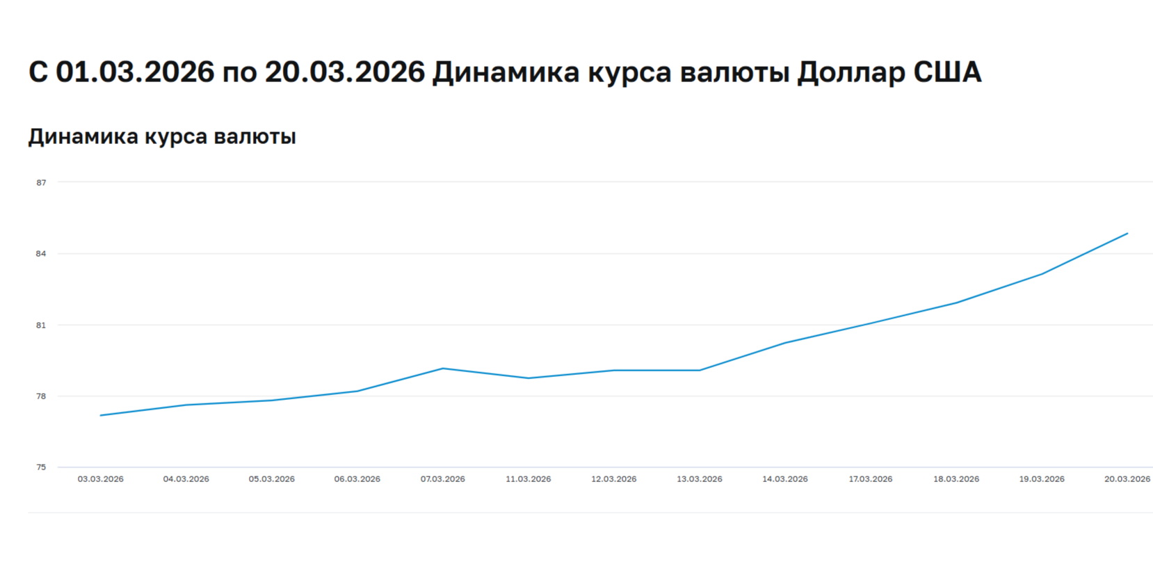 Однако удорожание нефти не повлияло положительно на курс рубля. Вместо того, чтобы укрепляться, российская валюта резко ослабла. Вчера курс доллара на внебиржевом рынке вырос сразу на 4,3%, до 87,45 рубля за $1. С начала марта национальная валюта упала на 9,9%, если судить по устанавливаемому ЦБ курсу валют.