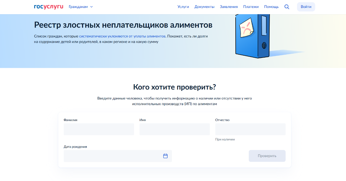 Проверить человека на долги по алиментам теперь можно за пару минут. На портале «Госуслуги» заработал открытый реестр неплательщиков. Сервис доступен всем без авторизации. Рассказываем, как его использовать.