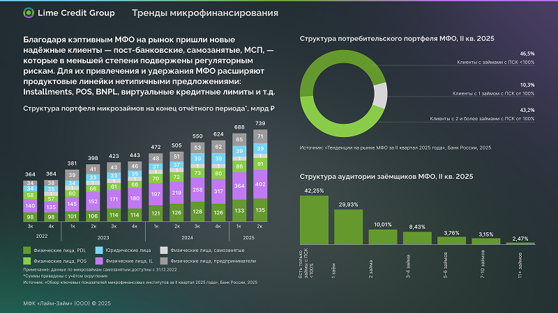 И банковские, и квазибанковские компании микрофинансового сектора — так называемые кэптивные МФО — привели в отрасль совершенно новую и довольно масштабную аудиторию на рынок: пост-банковских клиентов, которые ранее активно пользовались банковскими кредитами и кредитными картами, но из-за ужесточения регулирования оказались отрезаны от этого канала; самозанятых, ИП и представителей МСП, которые также ищут каналы финансирования для развития своего дела и не всегда могут претендовать на банковское кредитование.