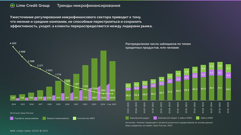 Если посмотреть на данные Банка России, количество компаний микрофинансового сектора за последнее десятилетие сократилось более чем вчетверо. При этом и выдачи, и портфель микрозаймов растут, как и количество клиентов, которые имеют заем в МФО или заем в МФО одновременно с кредитом в банке.