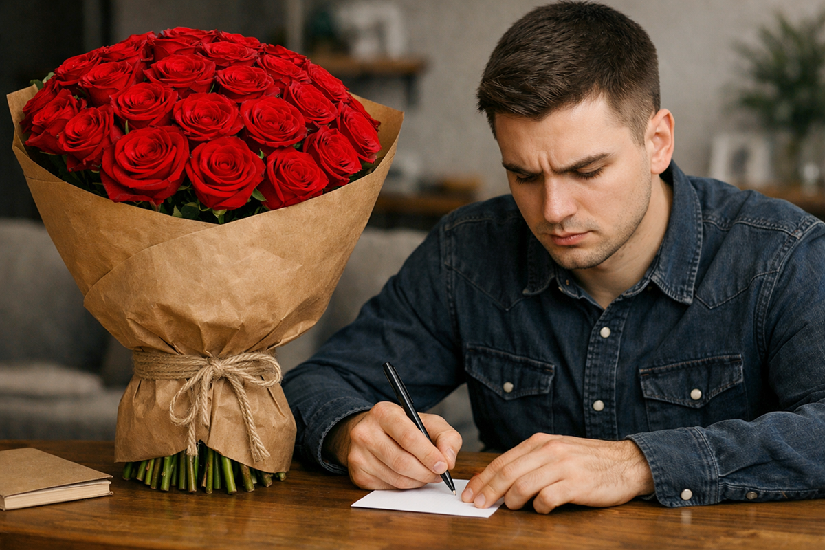 Скажите то, что давно хотели сказать, но не решались. Что-то простое и тёплое, что чувствуете именно вы. Для девушки это всегда будет неожиданностью и радостью, потому что это идёт от сердца, а не из интернета. Просто будьте собой — и неловкость уйдёт. Вы уже большой молодец, потому что взяли и купили этот букет для своей любимой. Всё получится!